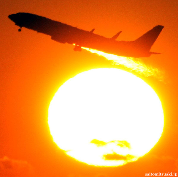 眩しさを放ちながら太陽が沈んでいくシーンで、小型旅客機が西の空へと離陸していく。