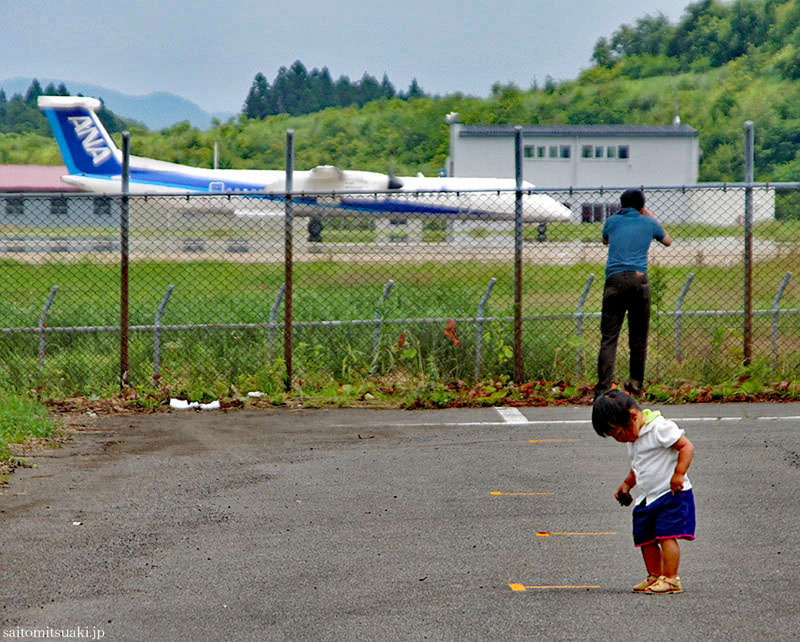 幼子が一人、出発のためプッシュ・バックされる旅客機を見つめていた。